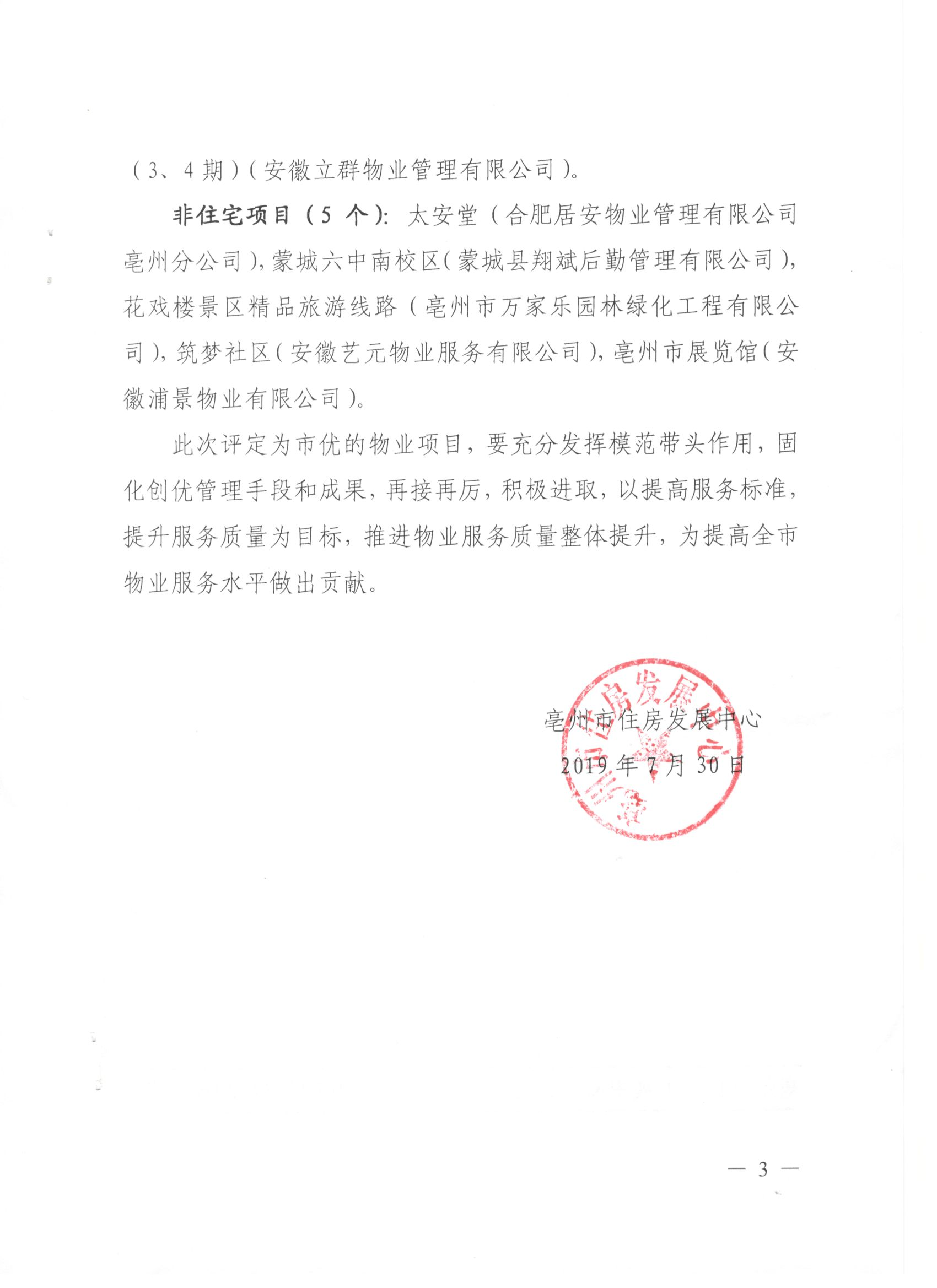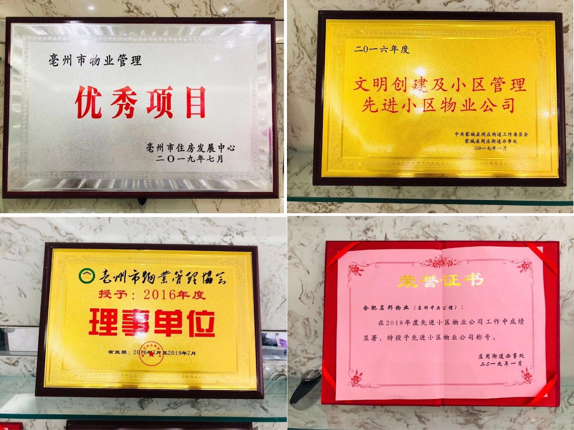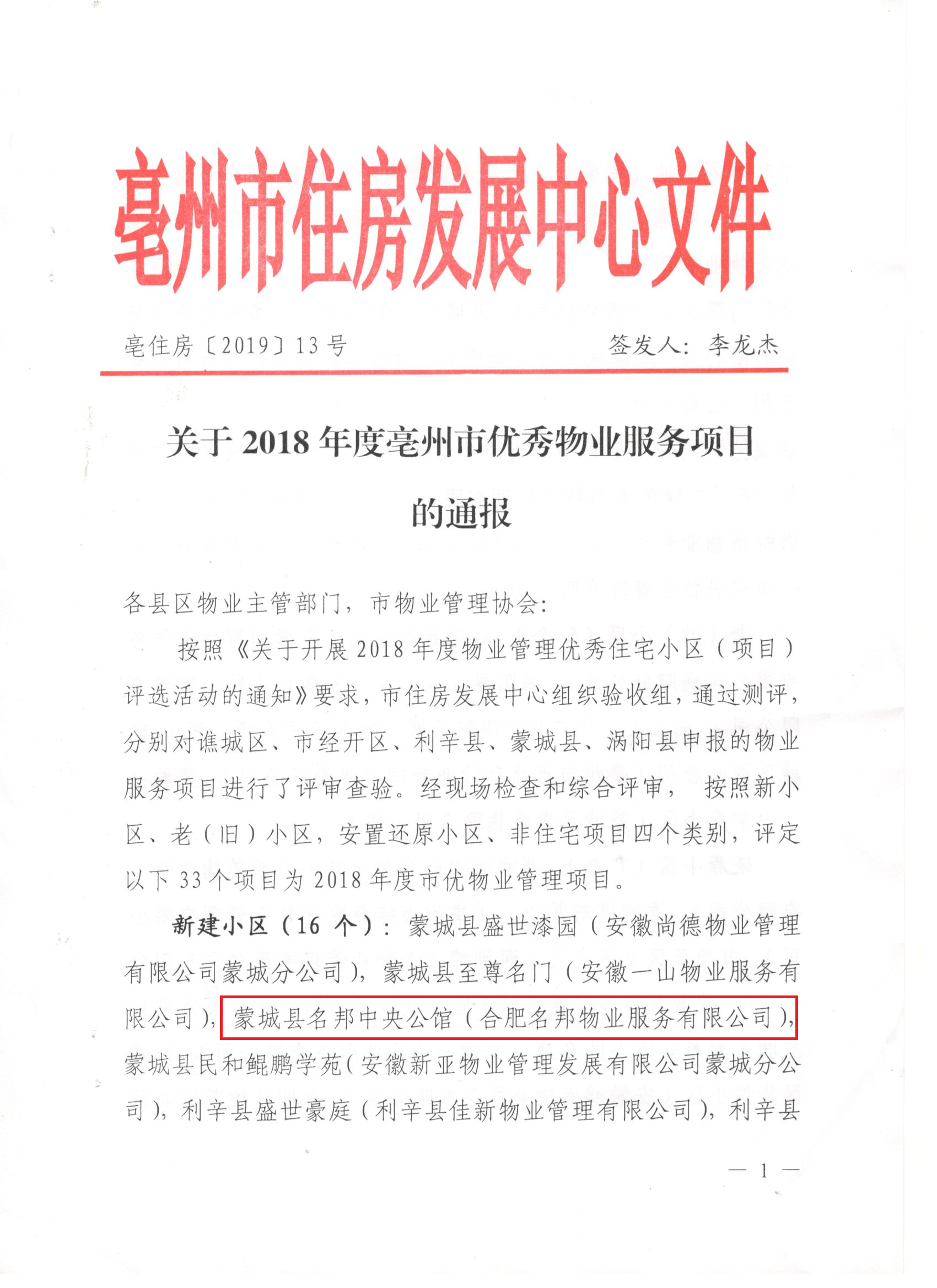根據(jù)亳州市住房發(fā)展中心最新頒布文件,名邦物業(yè)繼名邦·學府榮獲“安徽省物業(yè)管理優(yōu)秀住宅示范小區(qū)”稱號后,名邦·中央公館項目又榮獲“2018年度亳州市優(yōu)秀物業(yè)服務項目”榮譽稱號。此項榮譽的加冕,為名邦物業(yè)的品牌形象和服務標桿建設增添了濃墨重彩的一筆。