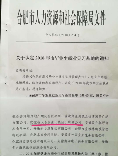 2018年5月23日,在合肥市人社局下發(fā)的《關(guān)于認定2018年市畢業(yè)生就業(yè)見習基地的通知》文件中,安徽省大名實業(yè)(集團)有限公司光榮上榜,再次獲評合肥市畢業(yè)生就業(yè)見習基地榮譽稱號,認定期限三年。