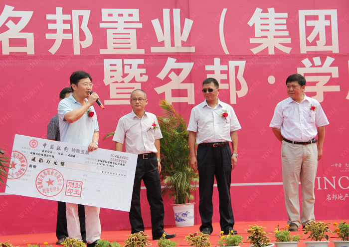 2011年7月22日,蒙城全城目光聚焦于城南新區(qū)新一中對面名邦·學(xué)府項(xiàng)目現(xiàn)場,遠(yuǎn)遠(yuǎn)望去彩旗飄揚(yáng),鑼鼓陣陣,洋溢著一派喜氣洋洋的氣氛。當(dāng)天這里舉行了名邦地產(chǎn)集團(tuán)向蒙城特殊教育學(xué)校捐贈暨名邦·學(xué)府開工及銷售中心開放活動。