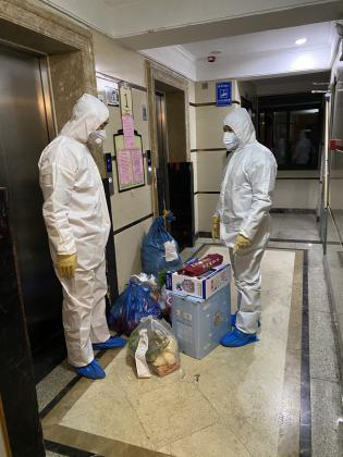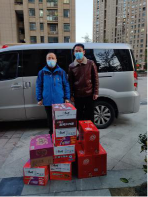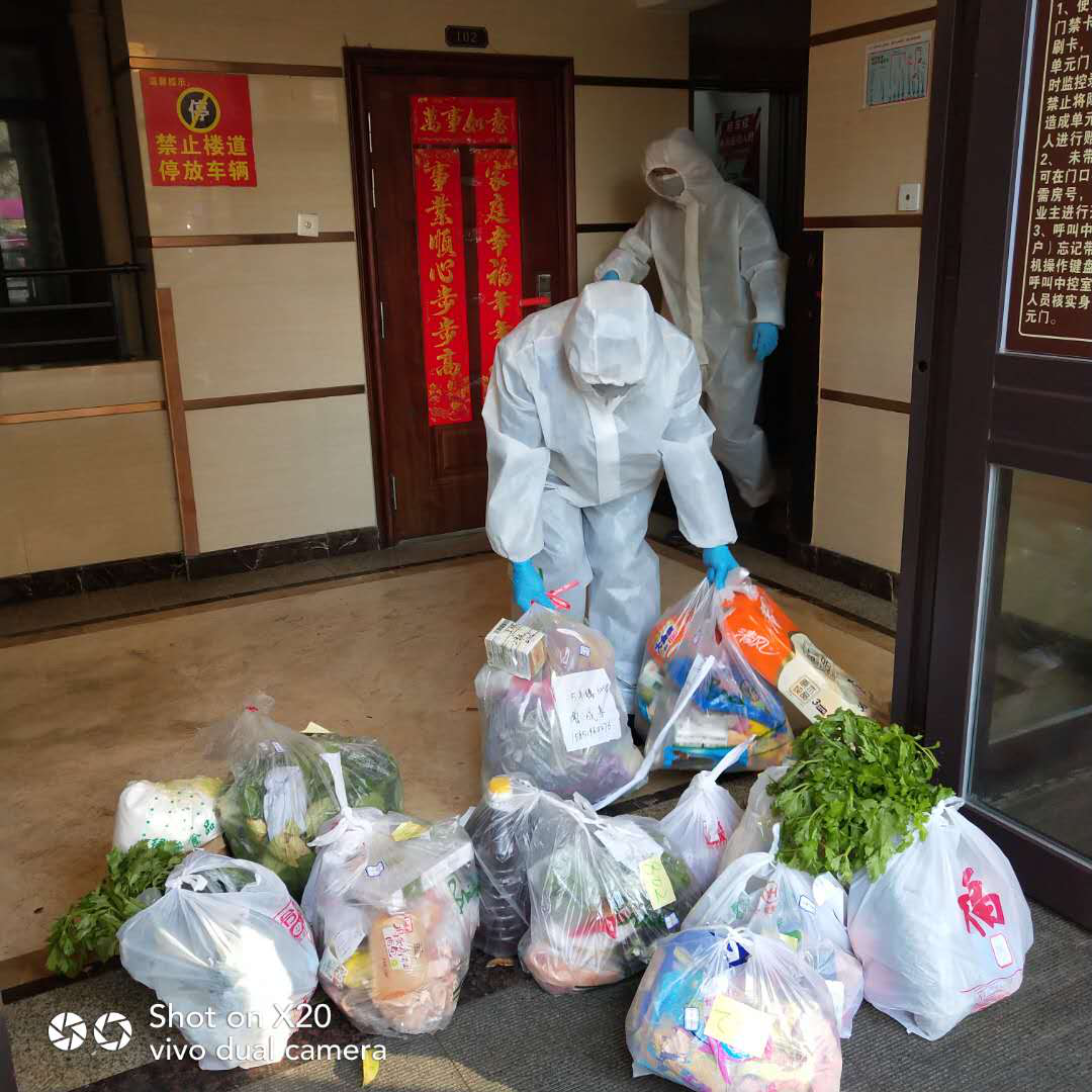 隔離業(yè)主出不了門,由社區(qū)采購或業(yè)主自行網(wǎng)購的物資,下午兩點半集中收至門崗后由專項責(zé)任人穿防護服、護目鏡、戴口罩每兩天進行一次集中派送,保證業(yè)主的生活供給。近700人的生活物資,分揀派送難度、工作量可想而知,他們沒有一絲怨言,整個團隊主動放棄休假,一群人從白天忙到黑夜,才完成一次派送。