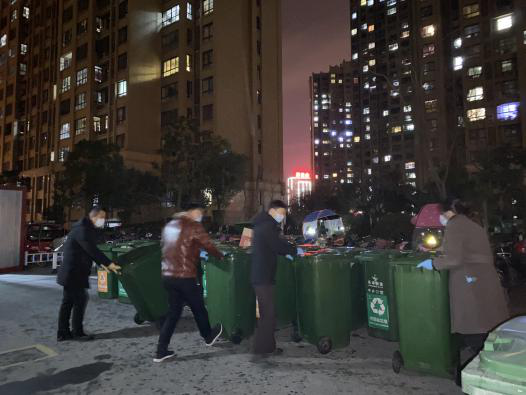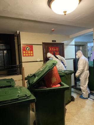 晚八點開始,抗疫工作小組成員的身影將在樓棟里交錯停留近4小時,他們將生活垃圾從頂層至一樓逐一清運,清運后的垃圾桶運至樓下進行消毒,垃圾傾倒后再次進行消毒。為避免交叉感染,該棟樓垃圾桶實行“專桶專用”,與園區(qū)垃圾桶區(qū)分存放。
