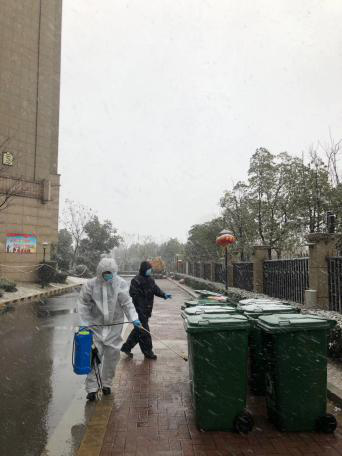 2月15日,天空陰沉沉的,合肥上空飄起了雪花,但是名邦物業(yè)人的腳步絲毫沒有停下來。他們無心欣賞窗外的雪景,一個接著一個頂著風(fēng)雪走向五號樓,他們太忙了,因為有近700位的住戶在等著他們送過來的菜下鍋,近20桶的生活垃圾等著他們清運......