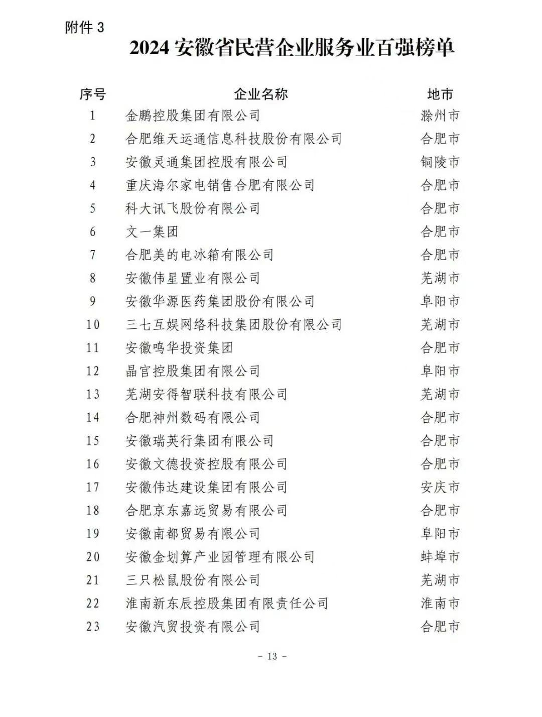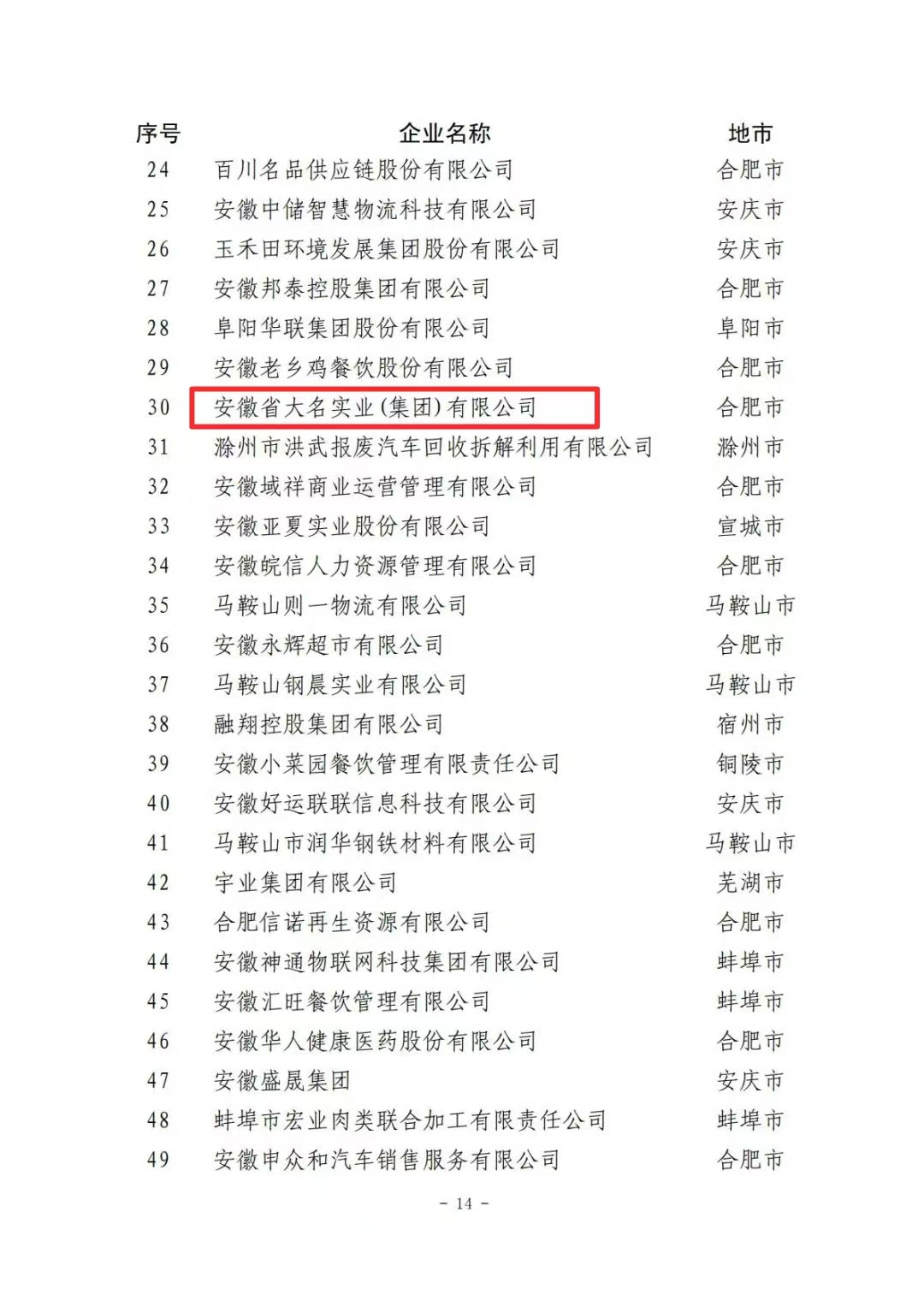 安徽省大名實(shí)業(yè)(集團(tuán))有限公司榮獲2024安徽省民營(yíng)企業(yè)服務(wù)業(yè)30強(qiáng)稱號(hào)!相比去年,安徽大名集團(tuán)排名提升4位!